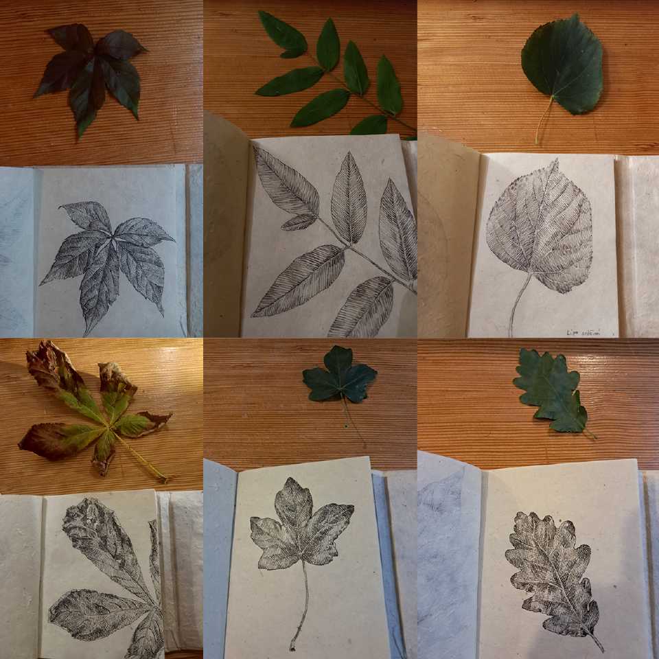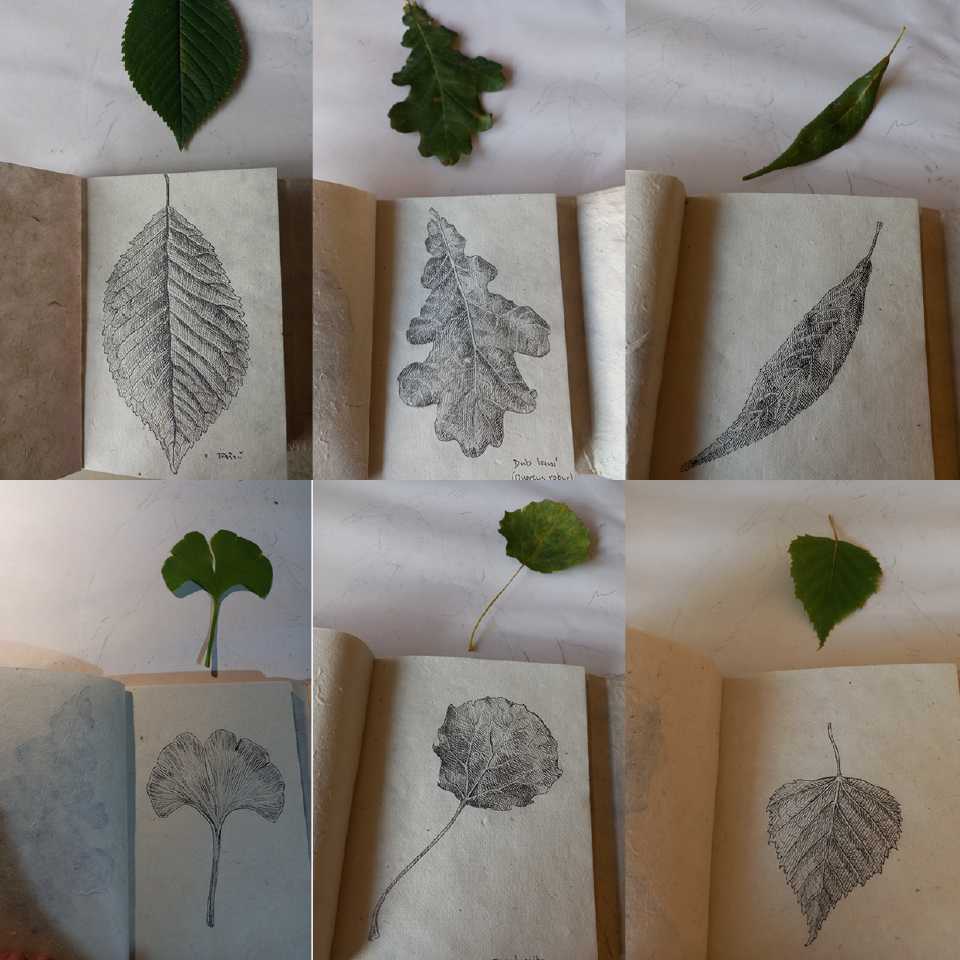 Kniha listů / The Little Book of Leaves, Kresba fixkami do skicáku s ručním papírem / Markers into sketchbook made from handmade paper, 2023/2024
